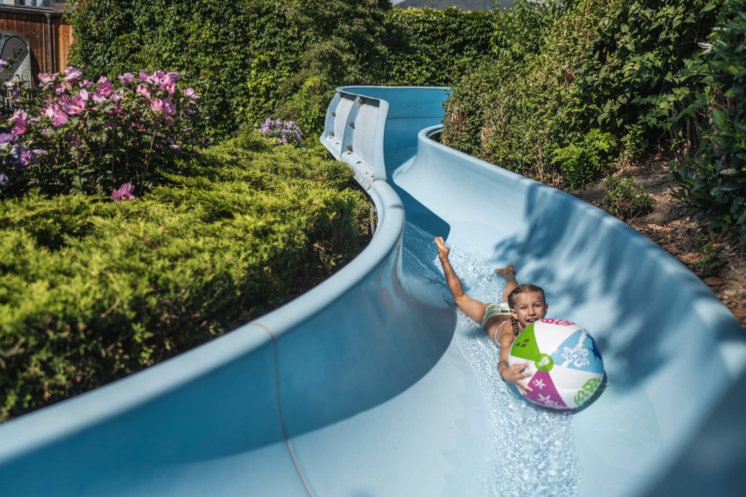 Zwei miteinander verbundene Planschbecken ermöglichen unbeschwerten Wasserspaß für die Kleinsten, während die größeren Kinder als Highlight eine 50 Meter lange Wasserrutsche vorfinden, die sich durch die gesamte Gartenanlage schlängelt.
