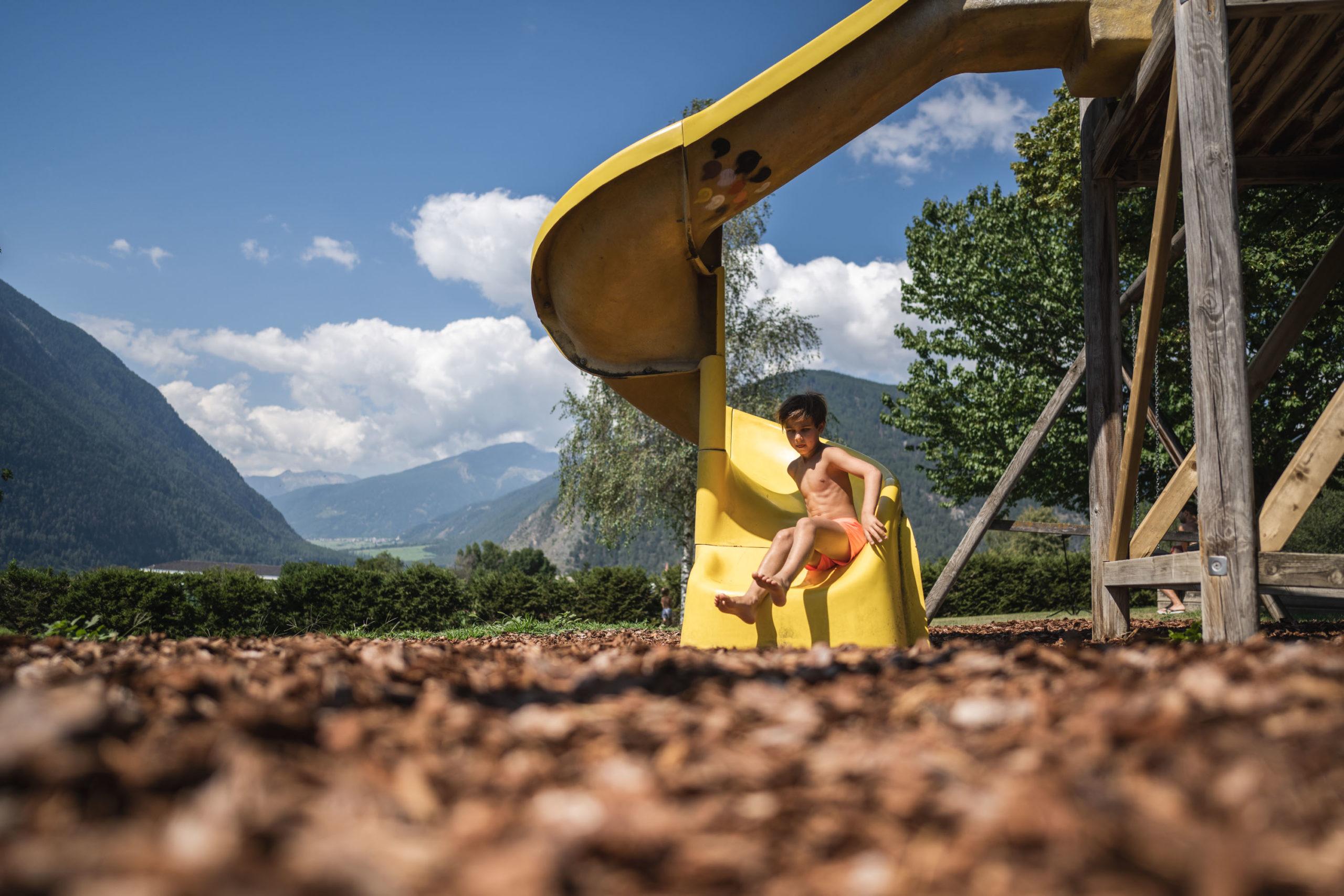 Die großzügige Liegewiese wissen vor allem die Eltern zu schätzen. Sie bietet genügend Raum, um unter der Vinschger Sonne oder an einem schattigen Plätzchen gemütlich zu schmökern oder einfach nur zu relaxen.