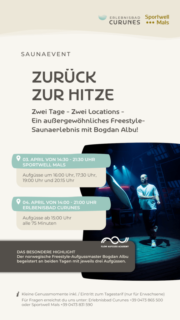 Erleben Sie am 03.04.2026 ein außergewöhnliches Freestyle Saunaerlebnis! Verwöhnendes Peeling, packende Aufgüsse und eine Atmosphäre zum Abschalten und Durchatmen. Gönnen Sie sich eine Auszeit, die alle Sinne berührt.